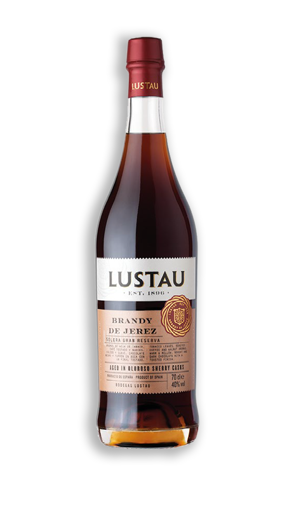 BRANDY DE JEREZ. SECO. Envejecido por 10 años en una selección de botas de roble americano que han contenido Oloroso durante muchísimos años, lo que marca un perfil característico de aromas de frutos secos, chocolate negro y nueces, y un sabor complejo y redondo.40 % Alcohol. Formato de botella: 70 cl